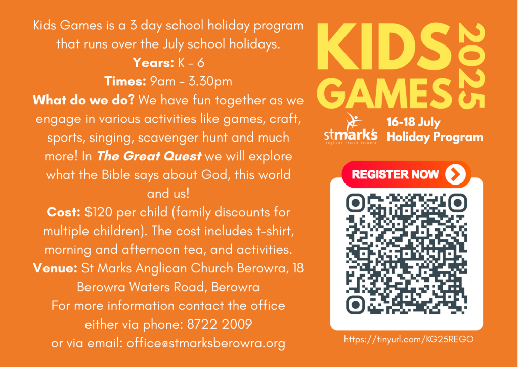 Kids Games is a 3 day school holiday program that runs over the July school holidays for Primary aged children. We have fun together as we engage in various activities like games, craft, sports, singing, scavenger hunt’s and much more! Each child receives a t-shirt, along with morning and afternoon tea as part of their rego.
